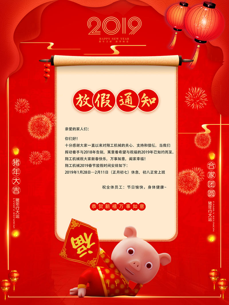 在2019年春節(jié)到來(lái)之際,翔工機(jī)械感謝大家對(duì)我們一如既往的支持與信任!在此我們獻(xiàn)上節(jié)日的問(wèn)候與祝福: