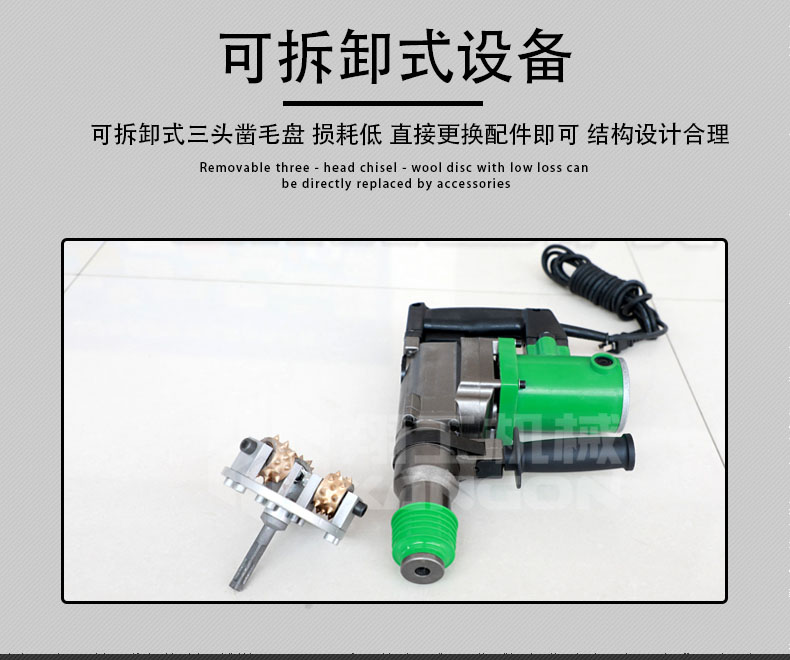 電動手持式鑿毛機(jī) 金剛石三頭鑿毛設(shè)備 小型水泥路面拉毛機(jī)。該鑿毛機(jī)型主要應(yīng)用于高鐵、高速公路橋面、隧道、水利水電、核電、市政道橋、大型集裝箱場地、停車場、室內(nèi)外混凝土地面翻新除險加固等混凝土面層鑿毛工程