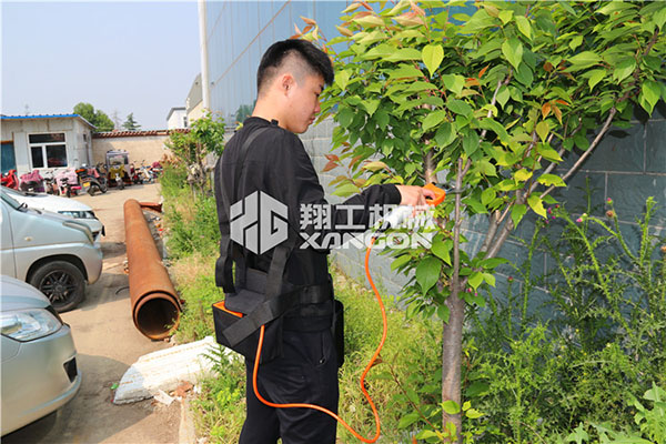 2.將電動(dòng)修枝剪固定連接電源穿過(guò)背包并連接到電池,穿戴好背包(把剪刀電源線穿入背帶的指定固定扣,防止使用時(shí)剪到電線)