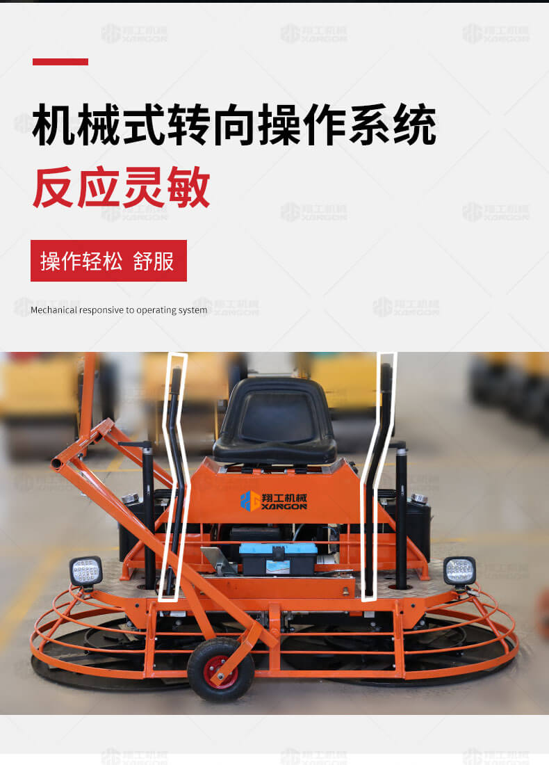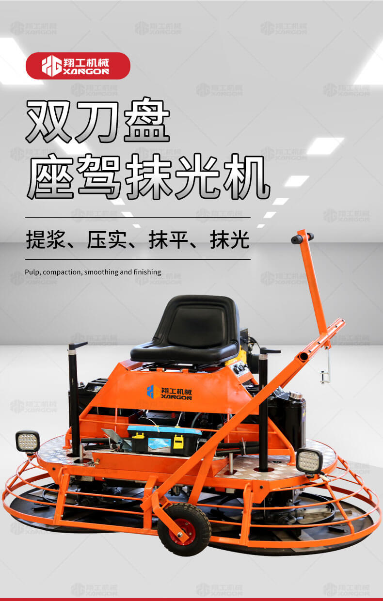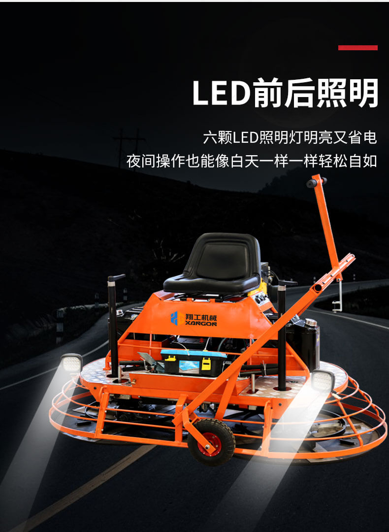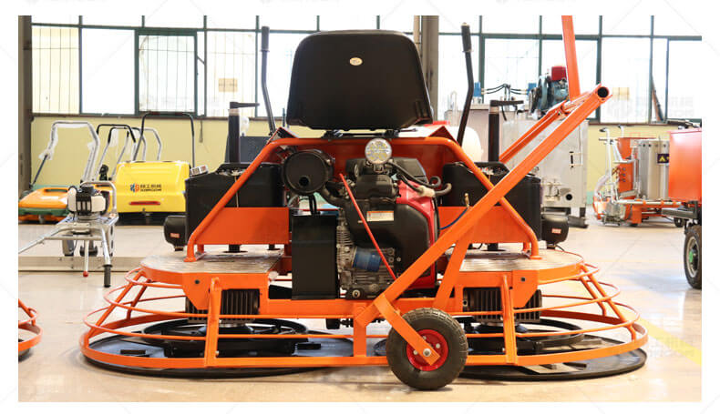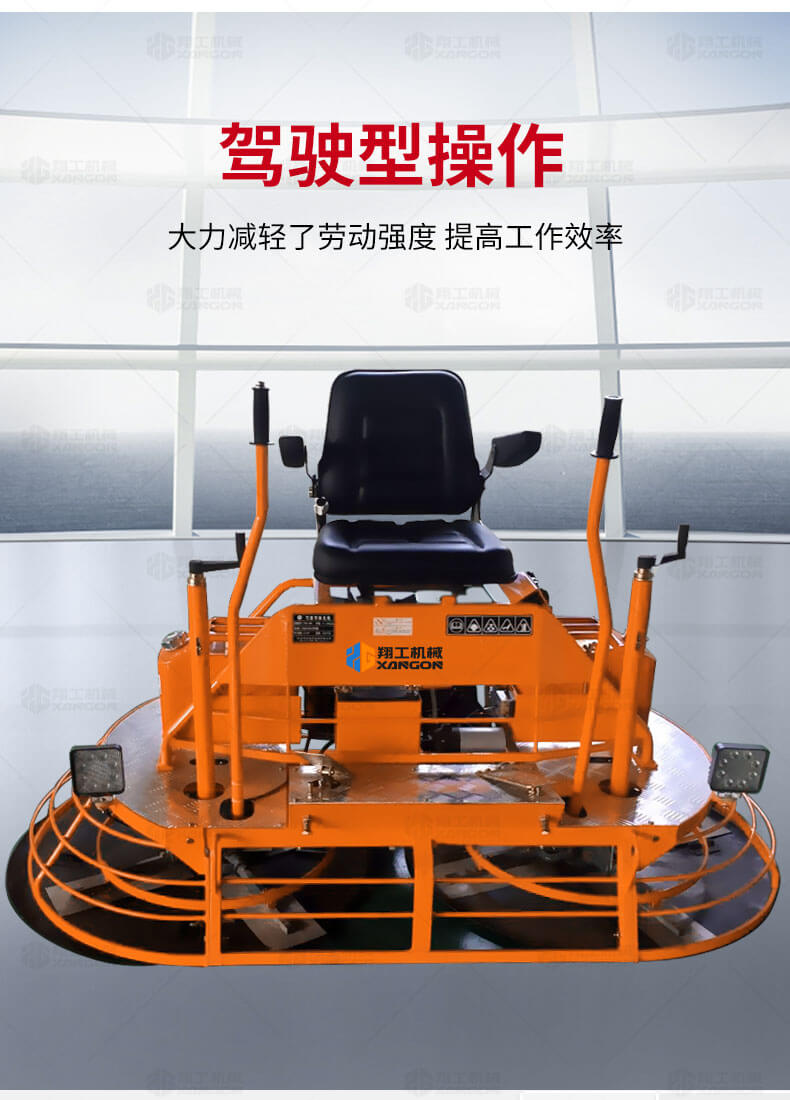 座駕式混凝土抹光機用于混凝土地面的提漿、壓實、抹平、抹光,相對于手扶式抹光機,效率高。