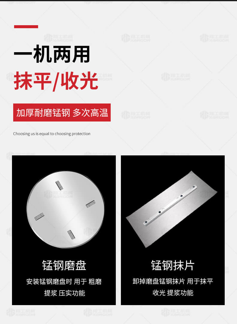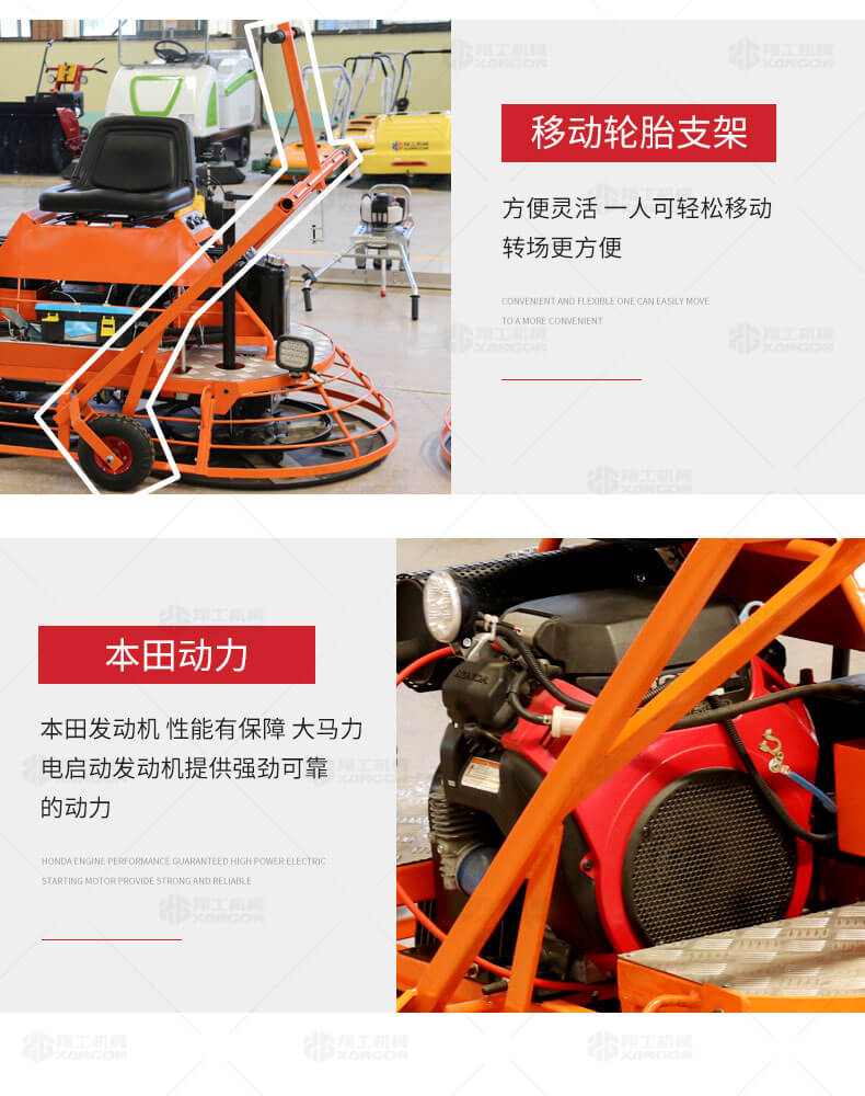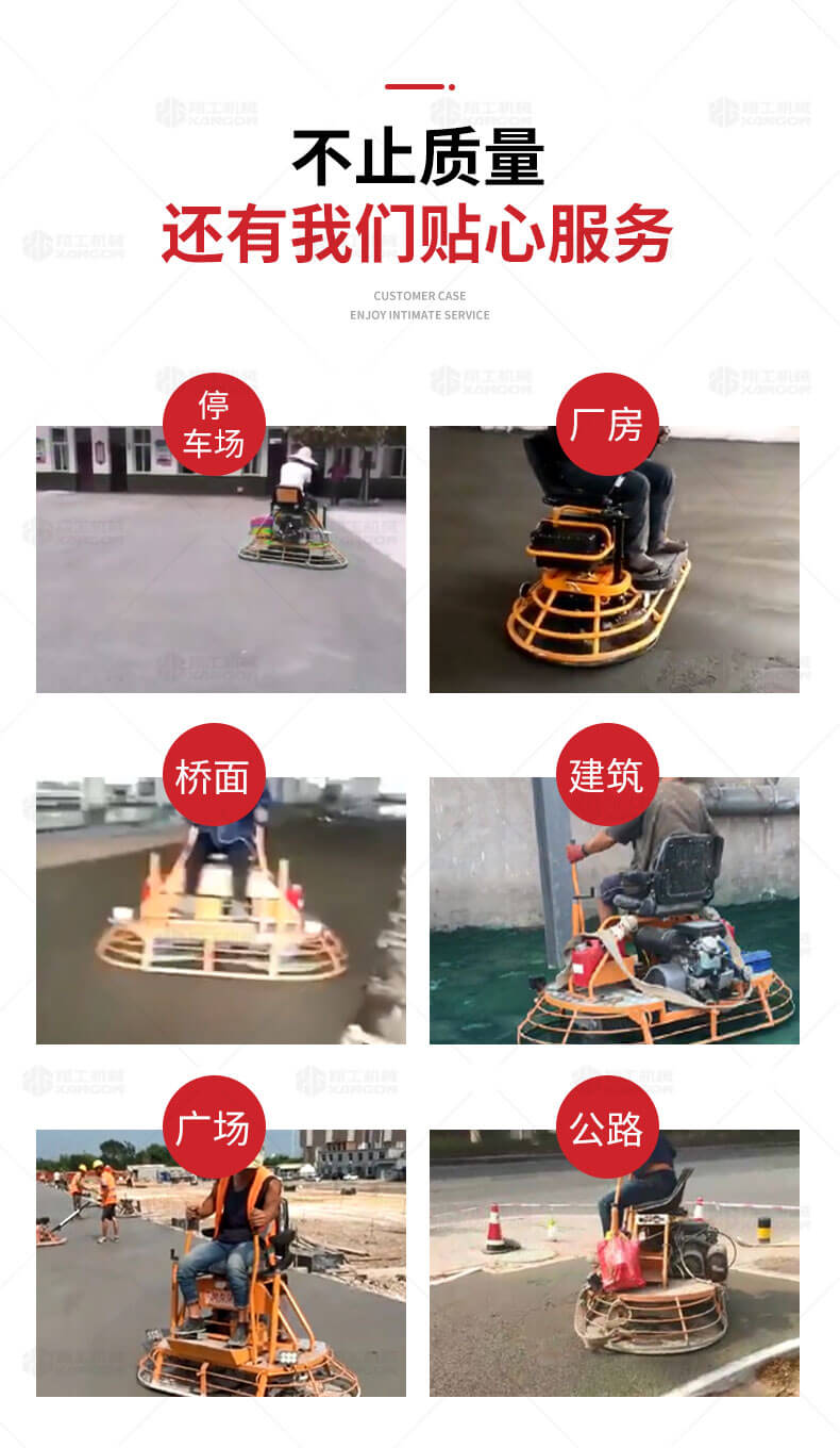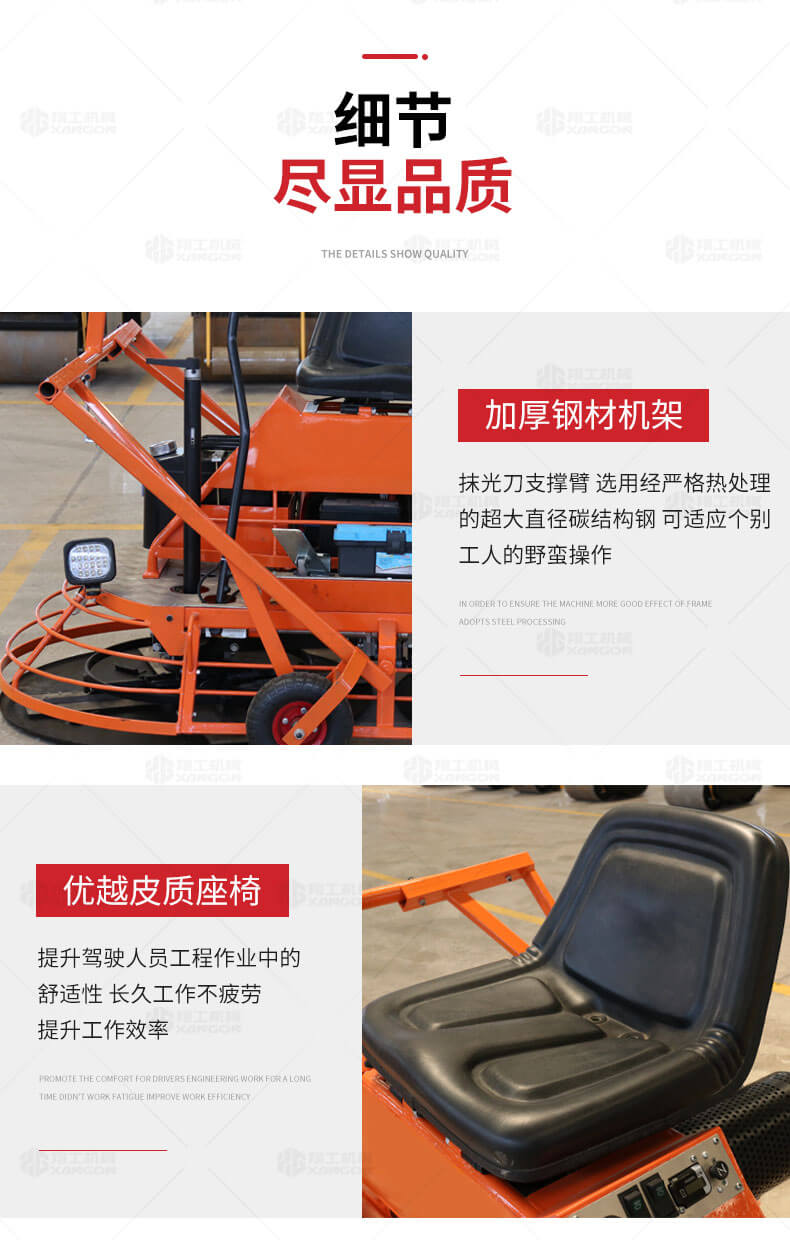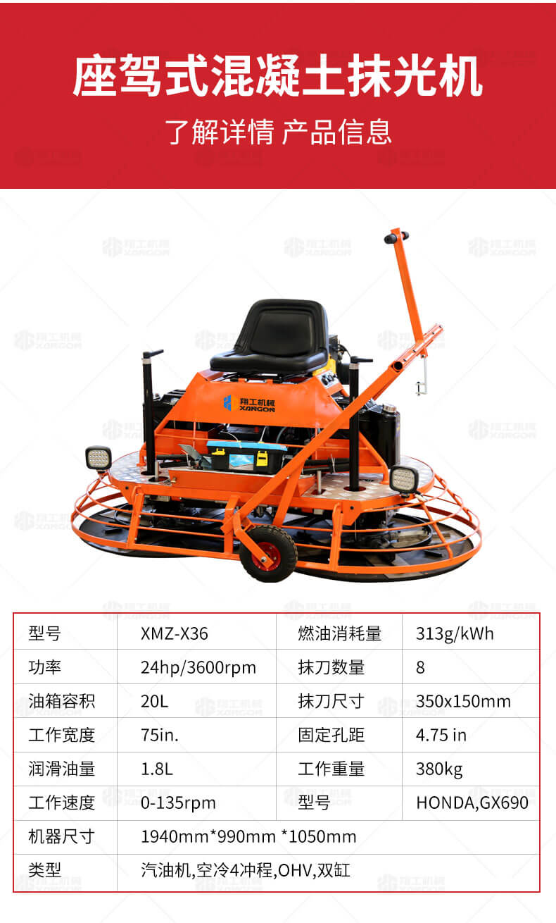 座駕式混凝土抹光機用于混凝土地面的提漿、壓實、抹平、抹光,相對于手扶式抹光機,效率高。