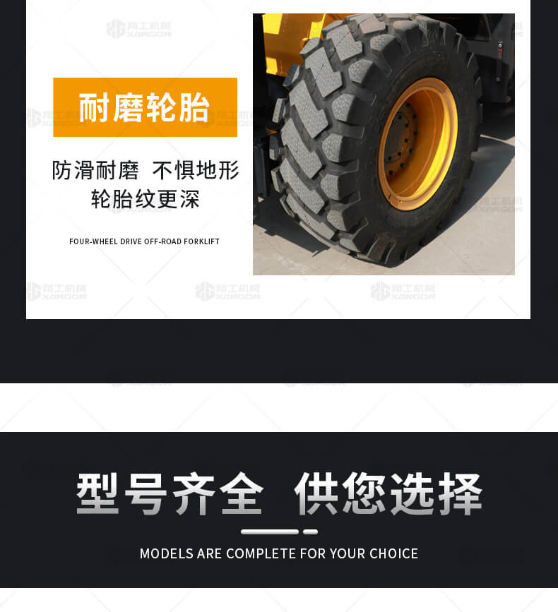 5.越野叉車發(fā)動(dòng)機(jī)功率大,采用全輪驅(qū)動(dòng)和越野輪胎。