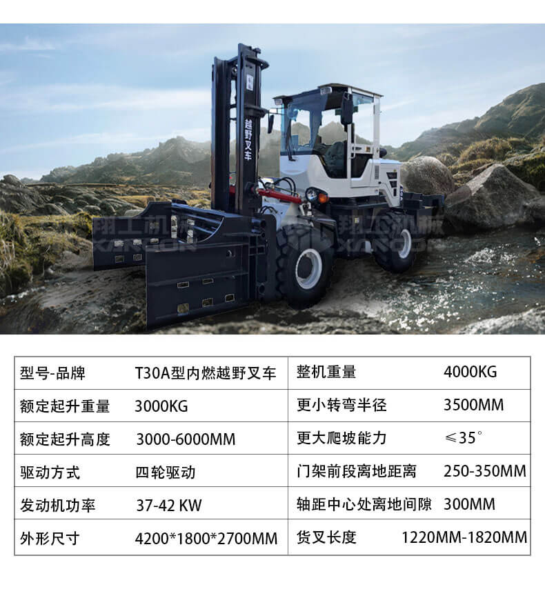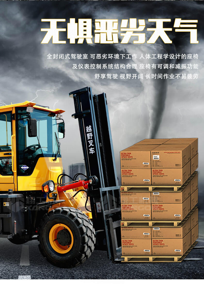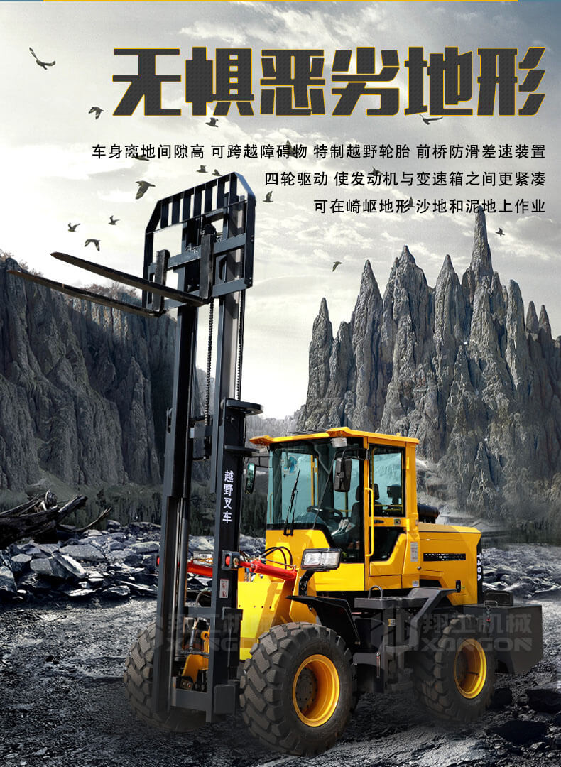 5.越野叉車發(fā)動機功率大,采用全輪驅(qū)動和越野輪胎。