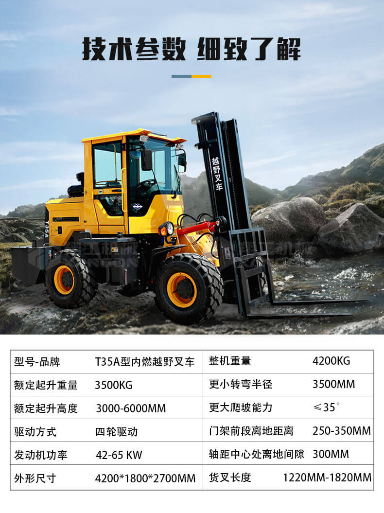 T35A型內(nèi)燃越野叉車可以在坡地和不平地面上進行貨物裝、卸、堆垛及搬運作業(yè),具有良好的機動性、越野性可靠性。其功能多樣,可搭配側(cè)移器、調(diào)距叉、旋轉(zhuǎn)器、軟包夾、推出器、側(cè)翻叉、側(cè)翻斗、起重臂等工具完成不同的工作。