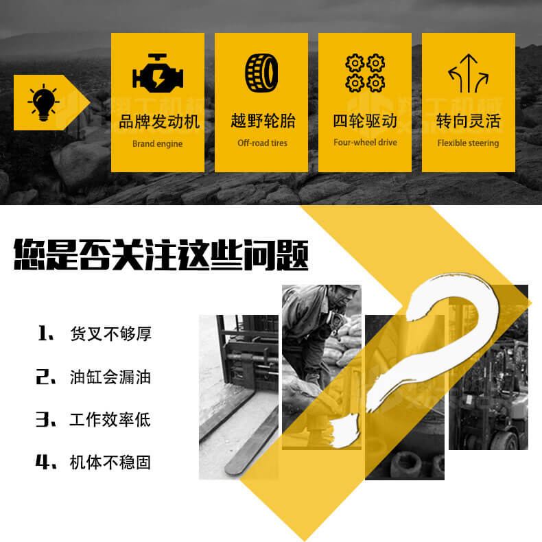 3.普通叉車只能在平整的路面上作業(yè),而越野叉車既可以在普通路面上作業(yè),還可以在山路泥路崎嶇道路作業(yè),輪胎抓地力強(qiáng),不打滑。