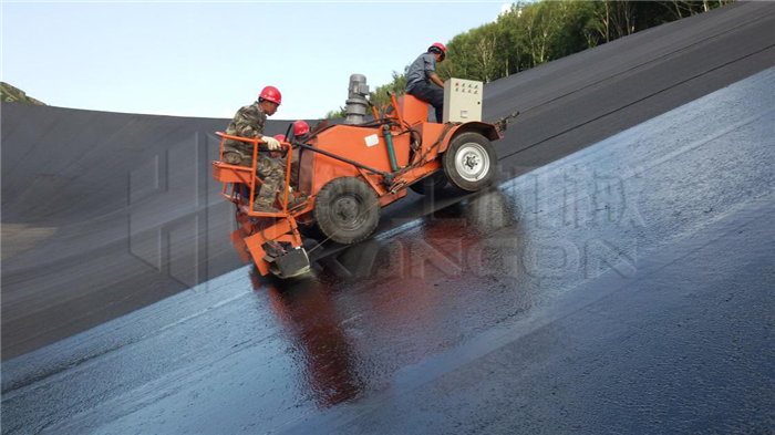 瀝青封閉層的施工采用適合于斜坡施工的專用瀝青瑪蹄脂涂刷機(jī),在牽引臺車的牽引下沿著面板從下往上涂刷。涂刷完一個條帶后,將涂刷機(jī)移動至下一個條帶繼續(xù)涂刷。瑪蹄脂封閉層涂刷作業(yè)時環(huán)境氣溫應(yīng)在10℃以上,涂刷溫度一般在170℃~190℃;施工完成的封閉層表面禁止無關(guān)人員和機(jī)械行走;特殊部位:壩頂及曲率半徑較小的圓弧斷,采用小型機(jī)械涂刷方式進(jìn)行機(jī)械涂刷進(jìn)行,環(huán)庫水平段及弧段全部采用小刮涂機(jī)配合人工進(jìn)行刮涂施工。