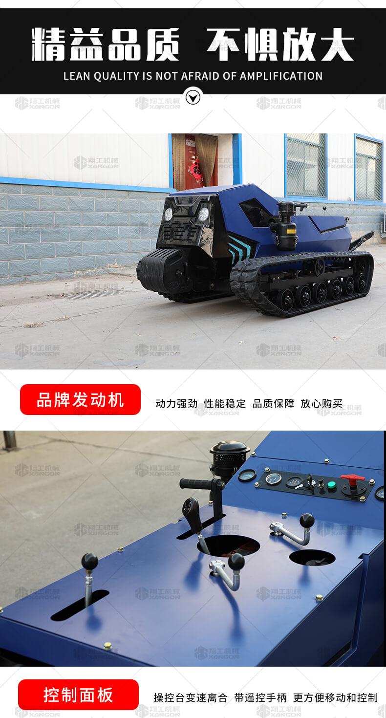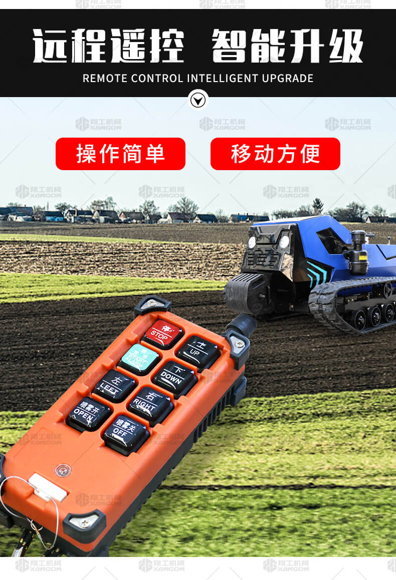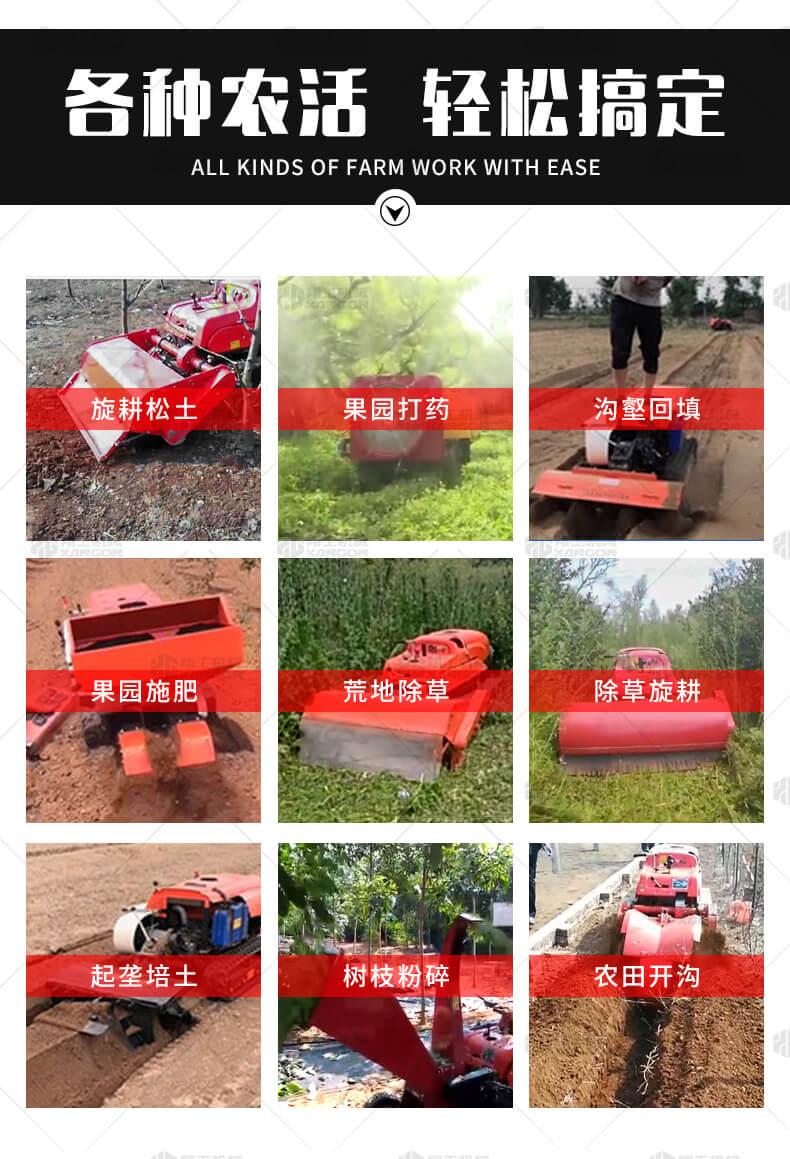 本產(chǎn)品采用履帶式驅(qū)動設(shè)計,穩(wěn)定性和爬坡能力較強(qiáng),適應(yīng)丘陵山地平原各種地形,機(jī)型小功率大,適應(yīng)各種行距的果樹,大棚,園林。產(chǎn)品動力強(qiáng)勁,結(jié)實(shí)耐用,性能優(yōu)越,安全放心,遠(yuǎn)程操控,省心省力。