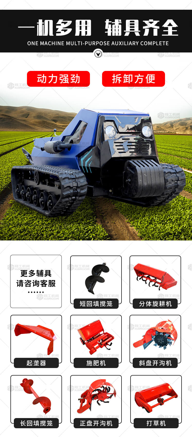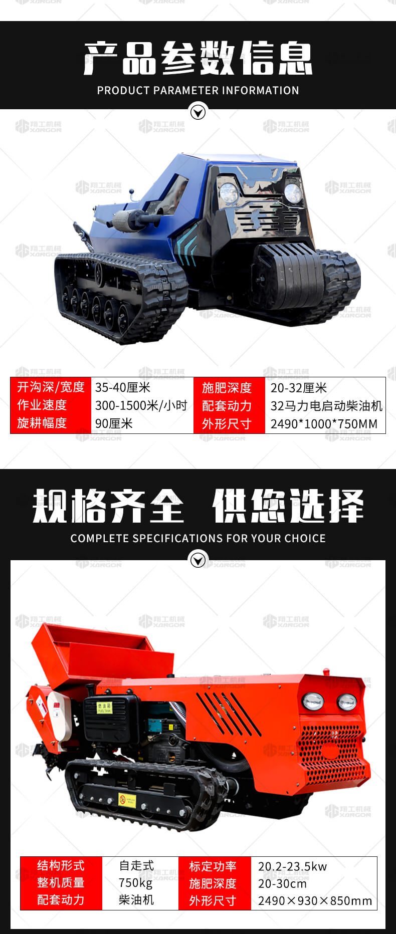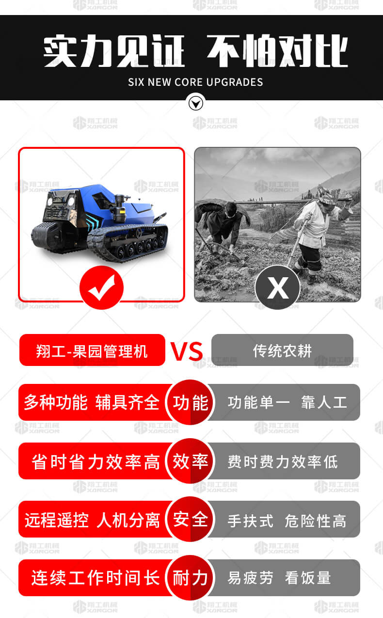 本產(chǎn)品采用履帶式驅(qū)動設(shè)計,穩(wěn)定性和爬坡能力較強(qiáng),適應(yīng)丘陵山地平原各種地形,機(jī)型小功率大,適應(yīng)各種行距的果樹,大棚,園林。產(chǎn)品動力強(qiáng)勁,結(jié)實(shí)耐用,性能優(yōu)越,安全放心,遠(yuǎn)程操控,省心省力。